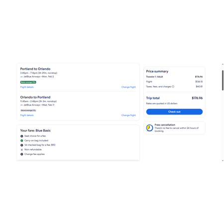 JetBlue and Expedia have round trip airfares travelling to and from Portland ME (PWM) and Orlando FL (MCO) for $177, nonstop. These are basic economy fares that allow a personal item and a carry-on bag. There is no seat selection and no change. If you are travelling with children, you will be seated together as per JetBlue's policy.