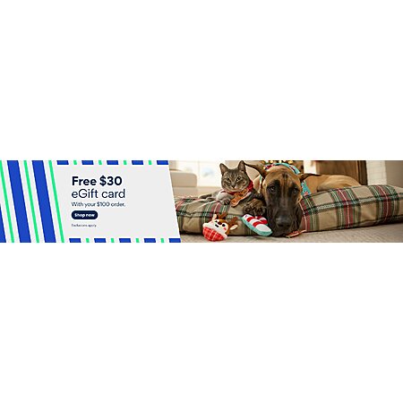 Chewy: Select Pet Products: Food, Toys & More $30 eGift Card w/ $100 Purchase + Free S/H (Exclusions Apply; Valid thru 12/14/25)