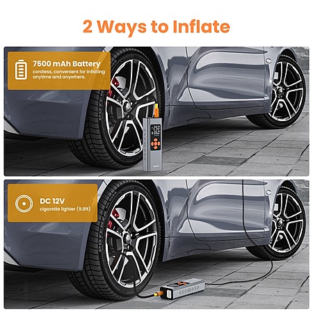 - Equipped with a 7500mAh rechargeable battery, the tire inflator includes built-in safety protection to prevent over-current and over-charging.