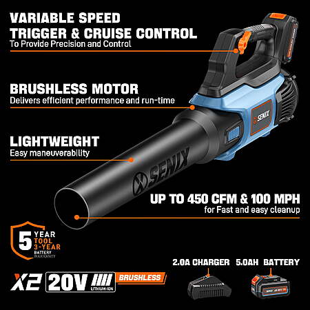 SENIX 20 Volt Brushless Leaf Blower with 5.0Ah Battery at Walmart $50