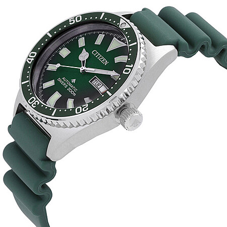 • Silver-tone stainless steel case with a green polyurethane strap. Uni-directional rotating green stainless steel bezel. Green dial with silver-tone hands and index hour markers. Minute markers around the outer rim. Dial Type: Analog. Luminescent hands and markers. Day of the week and date display at the 3 o'clock position. Citizen Caliber 8204-21A automatic movement. Scratch resistant mineral crystal. Screw down crown. Solid case back. Round case shape, case size: 41 mm, case thickness: 13.7 mm. Buckle clasp. Water resistant at 200 meters / 660 feet. Functions: date, day, hour, minute, second. Additional Info: iso 6425 certified diver's watch. Promaster Series. Dive watch style. Watch label: Japan Movt.