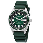 Product Description:- Silver-tone stainless steel case with a green polyurethane strap. Uni-directional rotating green stainless steel bezel. Green dial with silver-tone hands and index hour markers. Minute markers around the outer rim. Dial Type: Analog. Luminescent hands and markers. Day of the week and date display at the 3 o'clock position. Citizen Caliber 8204-21A automatic movement. Scratch resistant mineral crystal. Screw down crown. Solid case back. Round case shape, case size: 41 mm, case thickness: 13.7 mm. Buckle clasp. Water resistant at 200 meters / 660 feet. Functions: date, day, hour, minute, second. Additional Info: iso 6425 certified diver's watch. Promaster Series. Dive watch style. Watch label: Japan Movt.