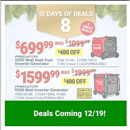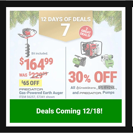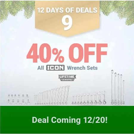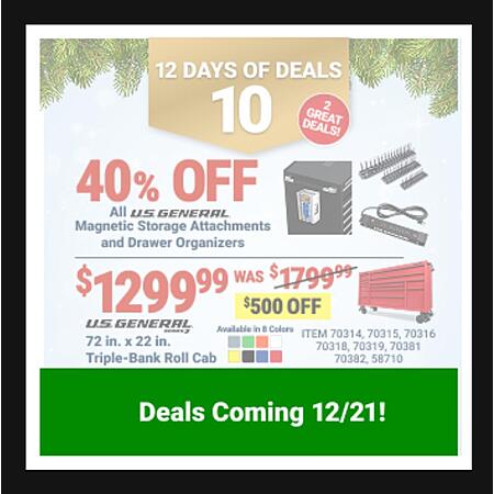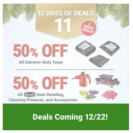 Harbor Freight [store locator] offers 12 Days of Deals with new deals daily from December 12, 2025, to December 23, 2025, in store only (discount applied at the register). Please visit your Local Store in order to purchase.