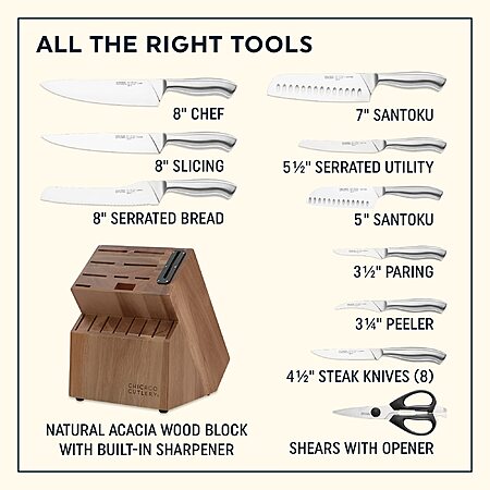 • 18 PIECES: This Chicago Cutlery set is made with durable, high quality stainless steel blades that resist stains and corrosion, ensuring they remain sharp and ready to use for years to come.
