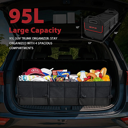 LARGE 95L CAPACITY FOR MAXIMUM STORAGE - This NEXPOW spacious trunk organizer features a 95-liter capacity with 4 compartments and multiple side pockets offering ample room to neatly store groceries, tools, sports gear, and emergency items. Product dimensions: 32"D x 15"W x 12"H.