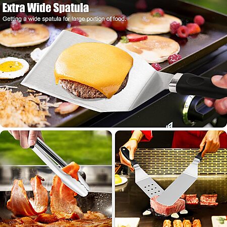 - FOOD GRADE PROFESSIONAL GRIDDLE TOOL: This griddle accessories set is made of high quality stainless steel which is rust-free, durable and long-lasting, every piece of the hibachi cooking utensils is strong enough to handle the stress of any busy commercial kitchen without deformation or broken. Various size spatula turners can handle small to large portion food with ease. Handle is heat resistant and long enough for safe cooking.