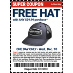 Harbor Freight offers a coupon for a FREE HAT with Any $29.99 purchase, valid Dec 10 only.