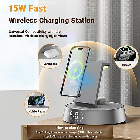 Freefish Wireless Alarm Clock Charging Station w/ Dimmable Night Light & Bluetooth Speaker (iPhone 17 16 15 14 13 12 Pro Max, iWatch 11) $14.99 + Free Shipping w/ Prime or on $35+