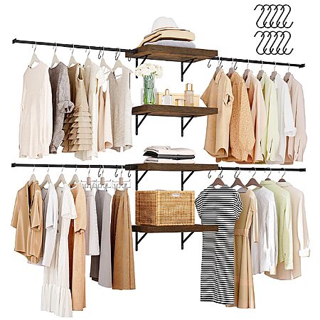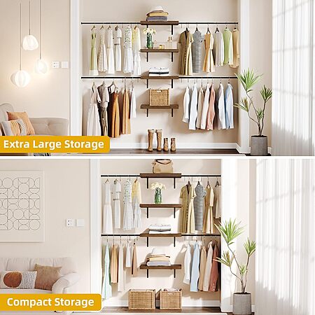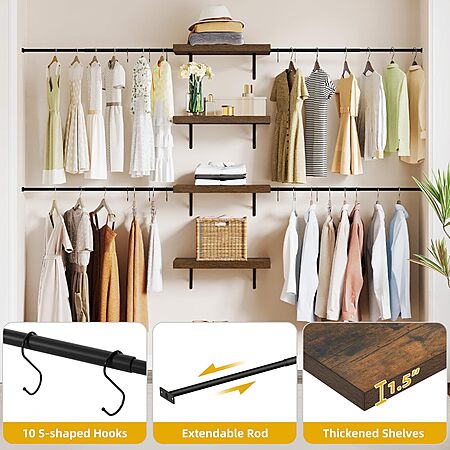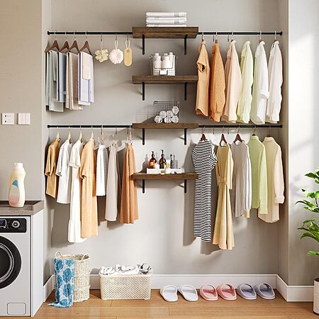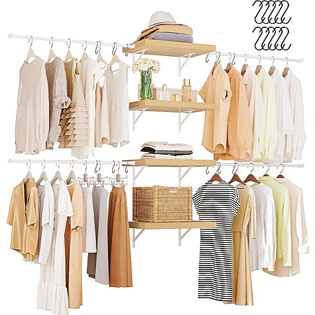 Model: DWVO Closet Organizer System, Wall-Mounted Garment Rack Walk In Closet System, 4 Expandable Hanger Rods 4-Tier Wood Closet Storage Shelves with Backplane, Fits 6-9 ft Space, White