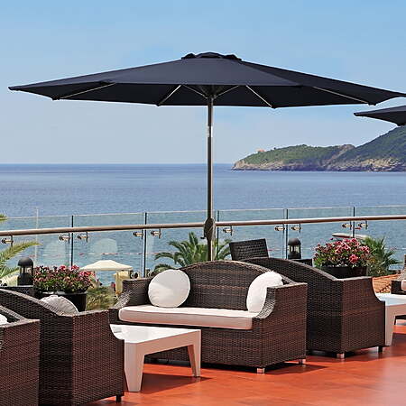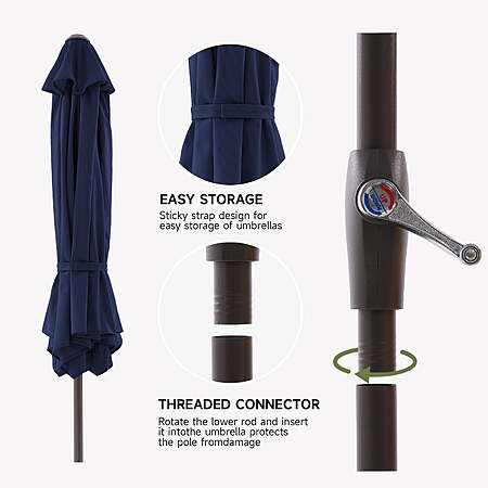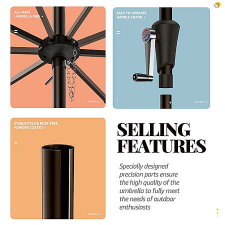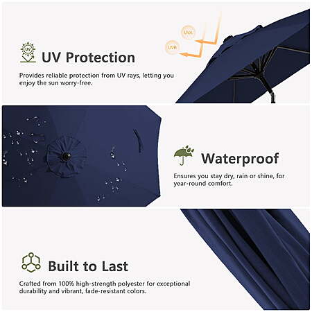 | Product Description: | Are you afraid of sunburn when you want to be close to nature in a sunny day? Now our patio umbrellas are here for your best choice for the problem. Turn your outdoor patio table into a shaded lounge for family and friends with our 10 ft patio umbrella! You can express your love with your lover after lunch as you want, waiting for enjoying the sunset. When your friends come, you can drink beer, chat about your life and enjoy the soft summer wind. The outdoor umbrella for patio with exceptional quality and stylish design will effectively block the sun. Our JUSTLET sunbrella patio umbrella is made of 200 GSM polyester fabric, UV resistant, waterproof, wind resistant and fade resistant. You don't need to worry about rust because we designed the heavy duty patio umbrella with anti rust powder coating. With a convenient crank lift and manual push-button tilt, you can easily open, collapse, and adjust the angle of this umbrella to suit your needs. It can lessen most of harm from strong sunshine and create romantic atmosphere at night. Suitable for almost all weather and everywhere from family to business like parties, deck, lawn, garden, hotel, park, barbecue bar, western restaurant, beauty salon. Note: Base not included. Multiple colors optional: Beige, Navy, Deep Green, Gray, Orange, Red, Blue. Ideal Sunshine Shelter: Providing large space for enjoying time outdoors. 10 ft patio umbrella shades your 42" to 54" round, square, or rectangular table and 4 to 6 chairs Hassle-free Mechanisms: There is a crank mechanism on the pole, making it easy for you to open or close the umbrella. Pretty simple. Besides, the angle of our sunshade is adjustable. Press the push button and tilt the umbrella for a wider range of shade Wind Vent Design: The canopy is vented to allow airflow and to give the umbrella more stability in windy conditions. The canopy fabric is made with an outdoor-rated solution-dyed polyester that minimizes color fading, provides UV protection and water-resistance Durable and Sturdy: Crafted with a solid-hued fabric canopy, this weather-resistant design has an iron pole in a powder-coated finish with a convenient crank lift and manual push-button tilt so there's no worry about rust and abrasion For Plenty of Occasions: You really need one patio umbrella at least. It can lessen most of harm from strong sunshine and create romantic atmosphere at night. Suitable for almost everywhere from family to business like parties, hotel, park, barbecue bar, western restaurant, beauty salon |