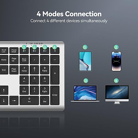 - 【4 Modes Connection】TECKNET's KB005 computer keyboard takes connectivity to the next level by adding a 2.4G wireless option to traditional tri-mode Bluetooth keyboard. You can effortlessly switch between 4 different devices (3*BT mode + 2.4G mode) with this full size bluetooth keyboard, expanding your device compatibility across desktops, laptops, tablets, phones, or smart TVs within a 15M. This wireless keyboard for laptop also auto detects & adapts to different operating systems, making your work more efficient & hassle-free