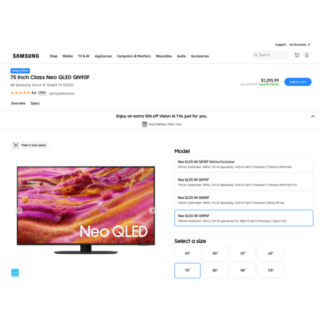 Samsung EPP: Neo QLED QN90F 75" for $1295.99 with free installation and 2 years of Samsung Care+