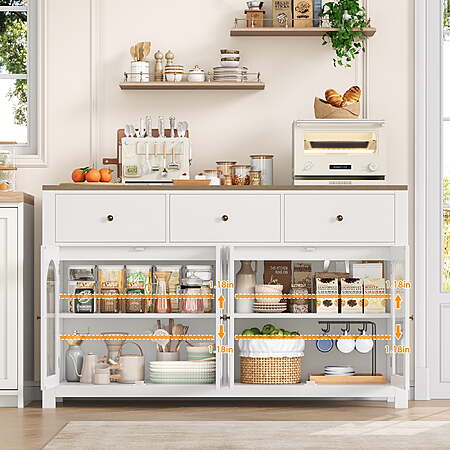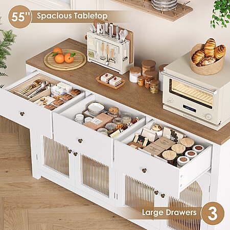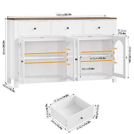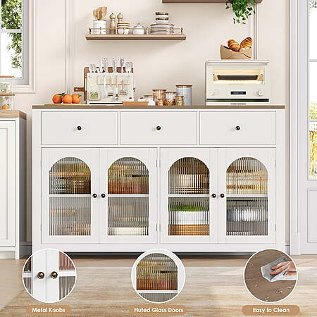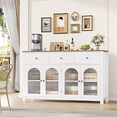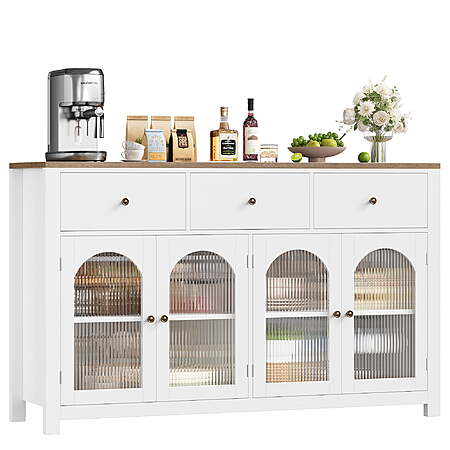 | Product Description: | Homfa - Creating a comfortable life! Homfa buffet cabinet, with spacious size 55.1"Wx15.7"Dx34.3"H, can provide large storage space for you. With 3 drawers, 4 glass doors cabinets and one wide tabletop, this white sideboard can easily hold all your daily kitchen utensils and keep your kitchen and dining room clean and tidy. Moreover, the adjustable shelves inside the 2 cabinets can meet the storage of your different items. This kitchen sideboard is made of the high-quality wood, sturdy and durable. The heightened base enhances the storage cabinet stability. Metal slides make the drawers run smoother and more stable. With its simple and modern design, this white buffet can adapt to any household style. Whether you send it for your friends as a gift or for yourself, this bar cabinet is a perfect choice. Features 【Modern Buffet Cabinet】With its simple and modern design, this buffet cabinet can adapt to any household style.The fluted glass doors, is more unique and elegant than the wood door, adding interior hazy beauty 【Large Sideboard with Ample Storage】With spacious size,55.1"Wx15.7"Dx34.3"H,this kitchen sideboard comes with a spacious tabletop,3 drawers and 4 glass doors cabinets,which can easily hold all your daily kitchen utensils and keep your kitchen and dining room clean and tidy. 【Sturdy & Durable】This kitchen buffet is made of the high-quality wood, sturdy and durable.The heightened base enhances the storage cabinet stability. Smooth metal slides make the drawers easier to open and closed. 【Adjustable Shelves】The shelves inside the 2 storage cabinets can be adjusted to 3 different heights ,allowing you to customize storage to suit your needs. 【Easy to Clean】With the high-quality wood, the sideboard is easy to clean for long term use and easy maintenance. 【More than Buffet Cabinet】This white cabinet is not only suitable as a buffet cabinet in your kitchen, but also suitable as a coffee bar cabinet in your dinning room, as a console table for your living room, as a storage cabinet or as a TV stand. 【Easy to Assemble】Including the detailed instructions and all needed parts, this kitchen cabinet is easy to assemble. 【24/7 Customer Service】We provide quality customer support, if you have any questions, please email us and we will reply within 24 hours. Specifications: Color: White Material: Engineered Wood Drawer Glide Material: Metal Drawer Handle Material: Metal Overall: 55.1"W x 15.7"D x 34.3"H Drawer Interior: 16.5''L x 13.4''W X 7.2''H Overall Weight: 119lbs Number of Drawers: 3 Number of Doors: 4 Adjustable Shelves:Yes Package Contents: 1 x Buffet Cabinet 1 x Assembly Kit 1 x Instruction |