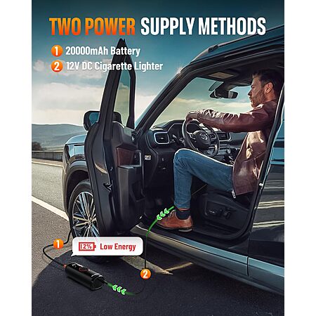 - 20000mAh lithium battery provides long battery life (3-4 hr charging via Type-C). Air pump for car tires as emergency power bank for phones/tablets with USB output. And cigarette lighter adapter provided.