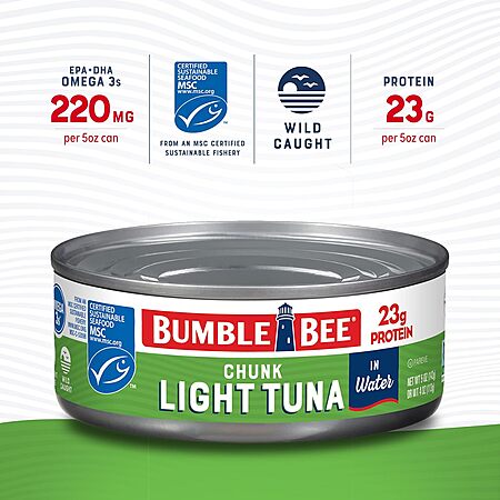 Bumble Bee Chunk Light Tuna In Water, 5 oz Cans (Pack of 48) - Wild Caught Skipjack Tuna - 23g Protein Per Serving - MSC Certified~$32.36 After Coupon & S&S @ Amazon