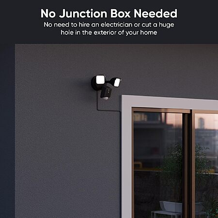 WYZE Floodlight Camera v2 with Plug-in Mount, 2K HD Outdoor Security Camera, Color Night Vision, Motion Activated, Electrical Box with 20ft Weather-Resistant Power Cable, $89.96