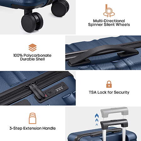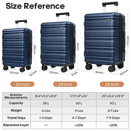 Lightweight Design: The luggage set is lightweight, with the 20-inch suitcase weighing 6 lbs, the 24-inch suitcase 9 lbs, and the 28-inch suitcase 11.7 lbs.