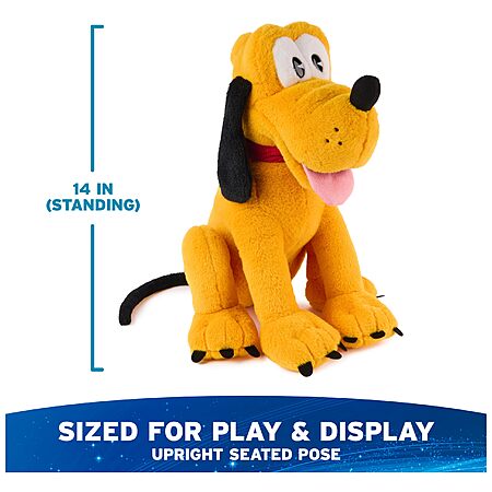 - Deluxe Pluto Plush: This 14" plush features Disney's Pluto in a seated pose with soft yellow plush and a red velvet collar. His irresistibly cute design features a faux suede tongue, faux suede nails, a matching nose, and embroidered whisker details