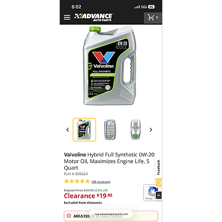Valvoline Hybrid Full Synthetic 0W-20 Motor Oil, Maximizes Engine Life, 5 Quart $14.96