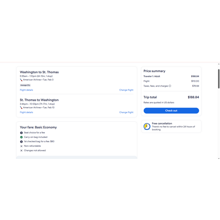 American Airlines and Expedia have round trip airfares travelling to and from Washington DC (DCA) and St Thomas USVI Caribbean (STT) for $189, making 1 stop both ways. These are basic economy fares that allow a personal item and a carry-on bag. There is no seat selection and no change. If you are travelling with children, you will be seated together as per AA's policy.