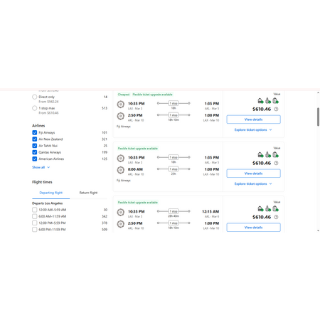 Fiji Airways via Booking.com have round trip airfares travelling from Los Angeles (LAX) to Auckland New Zealand (AKL) for $611, making 1 stop in Fiji. Choose from several hours stopover in Fiji or up to 24 hours as there are several flight options. These are value economy fares that allow a personal item, a carry-on bag and 1 free checked bag.