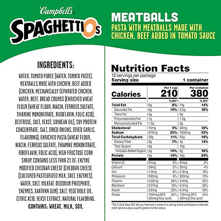 • Canned SpaghettiOs feature delicious tomato sauce and meatballs made with chicken and beef
