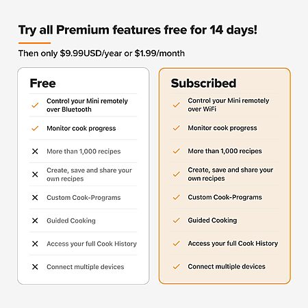• Anova App (subscription/Wifi connectivity): For $1.99 a month or $9.99 a year (cancel subscription at anytime), get access to the ultimate sous vide educational content and cooking guides. Recipes from professional chefs and the food nerd community feed directly to your Precision Cooker Mini at the touch of a button. Continuous access to your personal recipes and cook history, ready to revisit or share with your friends and family. Two week free trial included.
