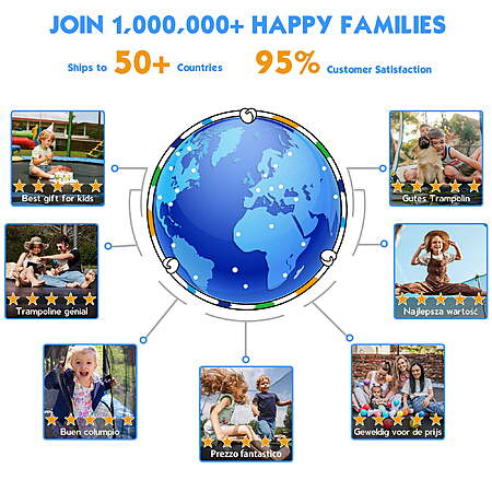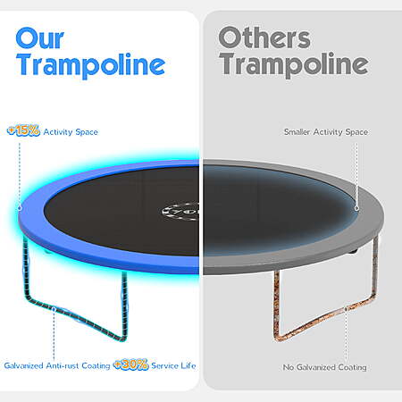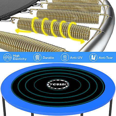 | Product Description: | YORIN 2025 Newest 8FT trampoline for kids employs upgraded structure and technology to make products much more securer. Provide your kids with a safe and fun way to exercise and keep healthy. We provide an extra trampoline light. 1. Our LED strip light can light up the rim of the trampoline hoop and have up to sixteen unique light patterns. It allows you to enjoy the fun of playing Trampoline at night. 2. The enclosure net of the trampoline is outside which makes the jumping area bigger than other trampolines. 3. All steel pipes are galvanized and sprayed with plastic powder, which is 100% anti-corrosion and anti-rust. 4. Trampoline EPE foam rod is covered with a PE sleeve which is rain and sun protection. 5. Larger wide-diameter & reinforced bouncy jumping mat surface; tall protective safety net cage enclosure system; waterproof rated & weather-resistant design; rugged & durable leg base frame construction; stable platform base for driveway and grass placement. 6. The galvanized steel frame is highly resistant to wear, dust, and erosion, ensuring superior durability and stability. Reinforced T-joints help to maintain stability and prevent structural wear and tear. 7. Clip safety lock and double secure zip help keep your kid safe inside the trampoline, and the UV-proof enclosure protects sensitive skin from strong sunlight. Note: 1. YORIN trampoline with enclosure is made with exquisite craft and nice material, it gives you total peace of mind without worrying about safety as long as you follow safety tips on warning labels and user manuals. 100% Satisfaction Guarantee: 1. We provide a 24-months warranty including all parts. 2. 30-day money back. 3. 24/7 customer service. 【Top Safety System】Safety always comes top priority. YORIN 8FT trampoline featuring maximum 800LBS load capacity, which can safely hold 2-3 kids. Note: When a person uses the trampoline alone, the recommended maximum weight is 330LBS to avoid injuries caused by a single-point force. 【YORIN Provide Perfect Bouncing Experience】YORIN trampoline manufactured with EU standard Polypropylene bounce surface provides unmatched rebounding force. The trampoline's high-weight capacity is wrapped with 48 hot-dips galvanized springs, all spring has undergone 20,000 extreme extension experiments without deformation. Those springs connect tightly with the jump pad and frame together to provide a comfortable jumping force and a deep impression of the jump. 【Hot-dip Galvanizing Technology & Heavy-duty Frame】YORIN 2025 newest trampolines use the latest hot-dip galvanizing technology to make the frame anti-rust, more stable and durable. And our unique two-steel joint design along with W-shaped legs provide a solid base for the whole trampoline. All visible parts are finished with a UV-resistant coating to protect the trampoline from the sun and premature material fading for longer life. 【Excellent Structure and Materials】YORIN trampoline for kids is constructed with a 5.2ft-high and 360-degree safety net that is UV, weatherproof and wear-resistant. It is firmly attached to the jumping mat all the way around, getting rid of the risk of getting kids' hands or feet caught in the gaps. The sturdy two-step ladder provides straight navigation on and off the trampoline. Besides, the springs are covered with a thick and durable pad that expands the jumping area. 【Premium Service & Easy to Install】YORIN trampoline includes the trampoline light, safety enclosure net, spring, spring cover pad, jumping mat, ladder & Spring Tool... YORIN provides 24 months of warranty service for all accessories and free replacement. Everyone knows how difficult instructions can be. We created very easy-to-follow instructions on how to set up your trampoline with net faster. Please feel free to contact us if you have any questions, we provide high-standard 24/7 customer service. |