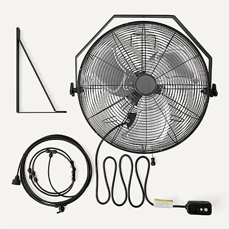 Model: Amazon Basics 18" Outdoor Misting Fan, Wall-Mounted, Industrial Fan, Waterproof (IP44), With Tilt Head, Heavy-Duty Metal Blades, Dual Ball Bearing Motor, 3 Speeds Up to 1550 RPM and 3781 CFM, Black