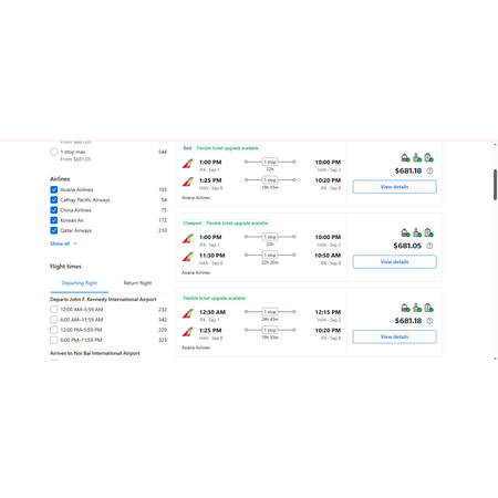 Asiana Airlines via Booking.com have round trip airfares travelling from New York (JFK) to Hanoi Vietnam (HAN) for $682, making 1 stop Seoul Korea for a couple of hours both ways. These are economy fares that allow a personal item, a carry-on bag and 2 free checked bags.