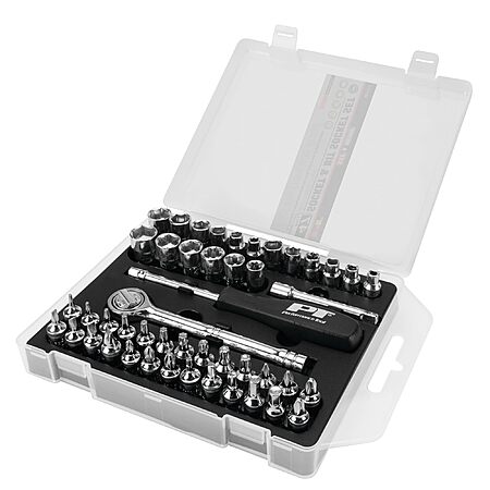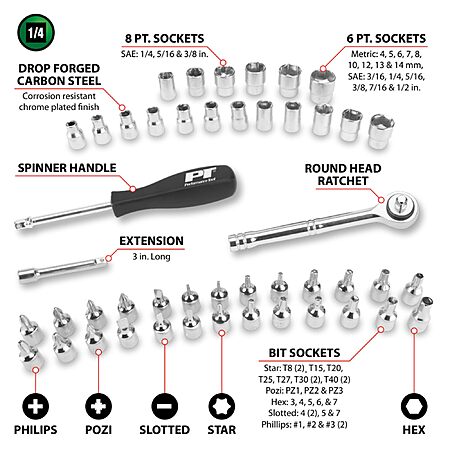 - COMPREHENSIVE CONTENTS: With (15) 6 Pt. 1/4-Inch Drive sockets and (3) 8 Pt. 1/4-Inch Drive sockets in addition to (26) 1/4-Inch drive bit sockets in various sizes and types, this Socket Set has everything you need to get the job done.