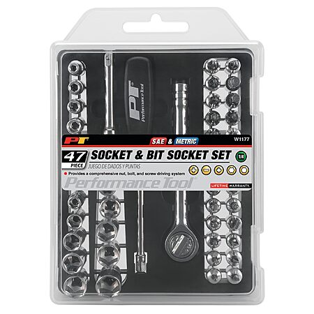 Amazon has quite a good price for this Performance Tool 47-piece socket set with a 1/4" ratchet, it's $9.23 there, other stores like MicroCenter sell it for $17.99 or more. The ratchet looks a bit old school but the driver sockets for torx etc. instead of common bits that you get with other sets might be useful.