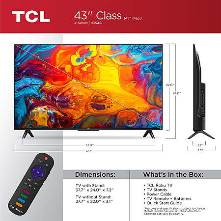| Product Description: | The TCL 4-Series Roku TV offers stunning 4K picture quality with four times the resolution of Full HD for enhanced clarity and detail, as well as endless entertainment with thousands of streaming channels. High dynamic range (HDR) technology delivers bright and accurate colors for a lifelike viewing experience. In addition, your favorite HD shows, movies, and sporting events are enhanced to near Ultra HD resolution with 4K Upscaling. Your favorite broadcast TV, streaming channels, gaming console and other devices are front-and-center within a simple, customizable home screen. There’s no more flipping through inputs or wading through complicated menus. The super-simple remote—with about half the number of buttons on a traditional TV remote—puts you in control of your favorite entertainment and includes one-touch shortcuts to popular channels like Netflix. Stunning 4K Ultra HD: Enjoy breathtaking 4K movies and TV shows at 4 times the resolution of Full HD. Plus your favorite HD shows, movies, and sporting events are enhanced to near Ultra HD resolution with advanced 4K Upscaling. High Dynamic Range: Enjoy enhanced contrast, accurate colors and fine details utilizing all the most advanced HDR formats. Simple, customizable home screen: Your favorite broadcast TV, streaming channels, gaming console and other devices are front-and-center, so you can spend your time relaxing – not scrolling. Stream what you love: Enjoy free TV, live news, sports, movies, and more. Endless free entertainment: Access the best selection of free entertainment with 250+ live TV channels, award-winning Roku® Originals, in-season shows, hit movies, kids’ TV and more. Live TV Channel Guide with 250+ free channels: Use the convenient live TV guide to surf broadcast TV and live streaming channels in one place. Cord cutting made easy: Cord cutters can access free, over-the-air HD content thanks to the advanced digital TV tuner with live channel guide or watch live TV from popular cable-replacement services like Sling, Hulu, fuboTV and more. Quick and easy search: Find any movie, show, song, or podcast across thousands of channels. You’ll see where it’s streaming for free or at the lowest cost. Get the newest features automatically: Your TCL Roku TV just gets better and better with automatic software updates. Simple remote: The super-simple remote—with about half the number of buttons on a traditional TV remote—has everything you need to control your TV, including one-touch access to popular streaming channels. Easy voice search and control with the Roku mobile app: Quickly find and play your favorite entertainment, control your Roku TV, and more using Roku TV on the free Roku mobile app. Works with popular voice assistants: Enjoy easy voice control with Siri, Alexa, and Google Assistant. Share it with Apple AirPlay: Effortlessly share videos, photos, music, and more from your Apple devices to your TV. Roku mobile app: Use the free Roku mobile app for iOS® and Android™ as a second remote. Enjoy private listening, search with your voice or keyboard, and save shows for later. Premium design with FullView: A sleek metal finish, slim profile, and FullView edge-to-edge glass design, lend style and sophistication to your home theater. Easy audio upgrade with Alto Sound Bars: Easily upgrade the sound of your TV with one remote, quick settings, and a simple setup. Just look for TCL Alto Sound Bars (sold separately) featuring the Roku TV ReadyTM Dual-band WiFi & Ethernet port: Get fast and easy access to your favorite content with the dual-band WiFi 5 connection or plug into the Ethernet port. 4 HDMI inputs (1 ARC): Connect all your favorite devices through the 4 HDMI inputs including 1 HDMI ARC to easily sync audio and video sources for better quality sound. |