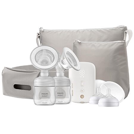 Philips AVENT Double Electric Breast Pump Advanced, with Natural Motion Technology, with Clear Natural Response Baby Bottles, White Pump, Gray Bag, Pouch, and Belt for $135