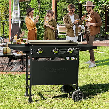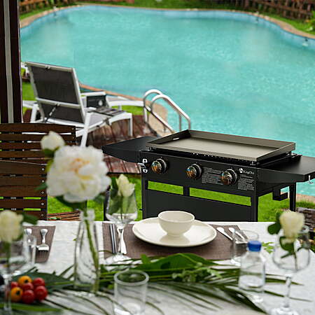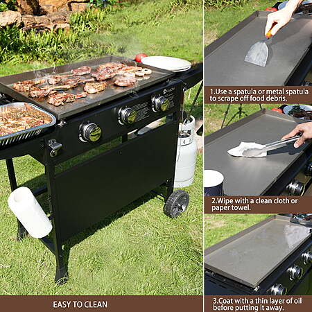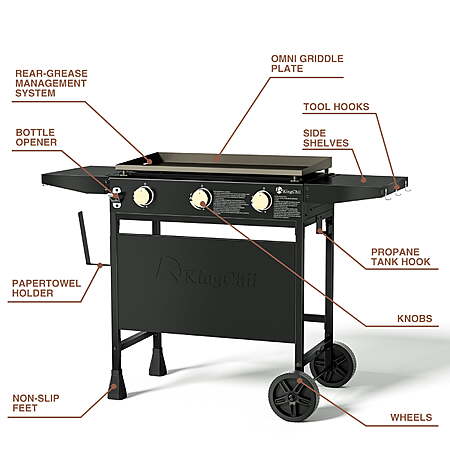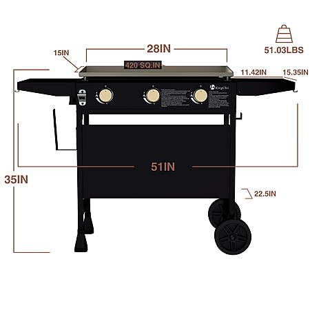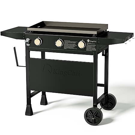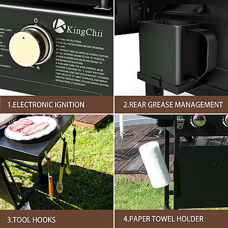 | Product Description: | A Propane Griddle, perfect for any outdoor space like gardens or patios, offers quick, adjustable heat without needing electricity. Its portable design makes it great for everything from backyard BBQs to camping. With even heat distribution, it's ideal for cooking a variety of dishes, providing a unique flavor that enhances outdoor gatherings with friends and family. 【Large Cooking Area】 The KingChii 28-inch propane griddle offers a spacious 420 square inches of cooking space, capable of grilling up to 25 burgers or 15 pancakes at once, making it perfect for family gatherings or large events. 【Multifunctional Cooking Platform】 From pancakes for breakfast to grilled cheese sandwiches for lunch and traditional barbecue for dinner, this griddle covers all your cooking needs, allowing you to prepare a variety of meals throughout the day. 【Consistent and Powerful Heat Control】 With three independently controlled burners delivering a total of 29,700 BTUs, the griddle ensures even heat distribution across the entire surface. Whether you’re searing steaks at high heat or gently grilling seafood at a lower temperature, you can precisely manage each cooking zone for perfect results every time. 【Easy to Clean】 The rear grease management system simplifies cleanup by channeling food debris and grease into the rear cup, making maintenance quick and hassle-free. 【Convenient Folding Side Shelves】 Two side shelves provide ample space for storing seasonings, plates, and tools, and can double as prep stations for handling ingredients. The foldable design makes it easy to store and transport, offering added flexibility and convenience. 【Practical Extra Features】 The griddle is equipped with a towel bar, bottle opener, and hooks for enhanced usability. Whether grabbing a paper towel or hanging your cooking tools, these thoughtful additions make your outdoor cooking experience even more efficient and enjoyable. SPECIFICATIONS: Brand: KingChii Model: KC1995C3 Special Feature: Utensil Hook, Wheels, Side Shelf Frame Material: Metal Installation Type: Free Standing Fuel Type: Propane Color: Black PACKAGE INCLUDES: 1 x Griddle 1 x Accessory Kit 1 x Mamual |