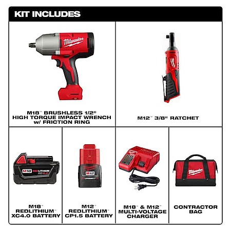 Milwaukee M12 3/8 in. Ratchet and M18 brushless 1/2 in. High Torque Impact Wrench with M18 4.0 and M12 1.5 batteries, $299, FS, Home Depot