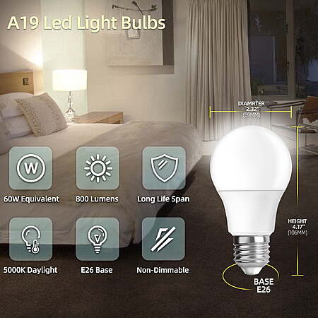 Model: DAYBETTER A19 LED Light Bulbs, 60W Equivalent,5000K Daylight, 9W 800 Lumens,E26 Standard Base,UL Listed,Lighting for Bedroom Living Room Home Office,6 Pack