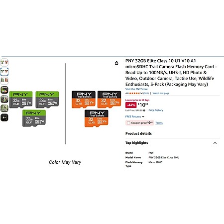 PNY 32GB Elite Class 10 U1 V10 A1 microSDHC Trail Camera Flash Memory Card 3 Pack - Amazon $10.03