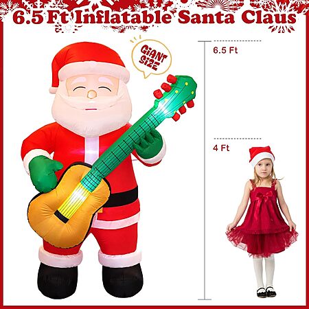 Product Description from Amazon:- Unique Musical Santa Claus: Our 6.5ft inflatable Santa Claus is holding a guitar, adding a musical touch to your Christmas decorations. Display this inflatable decoration in your yard to create a warm and festive atmosphere for the holiday season. It is sure to capture everyone's attention.