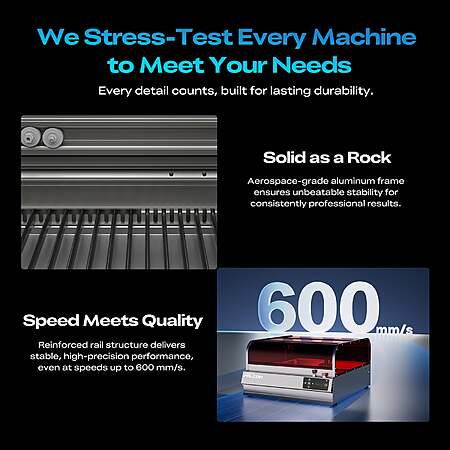 It can engrave and cut common materials like wood, plywood, leather, rubber, paper, acrylic, and coated or anodized metals. It includes a built-in camera for alignment, which is useful for repeat jobs and placing designs.