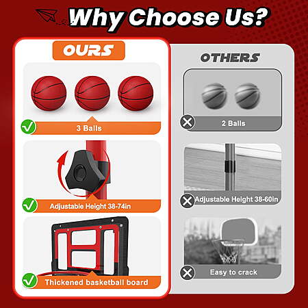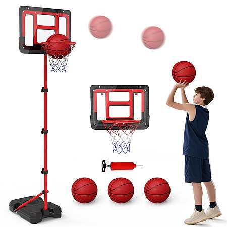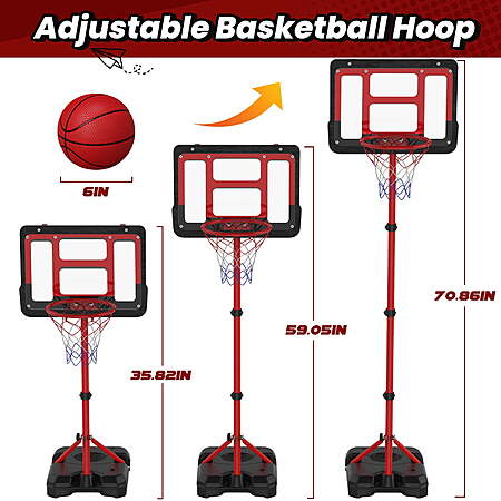 - Mini Basketball Hoop for Kid - This toddler basketball hoop is a complete set equipped with a basketball backboard, 3 basketball, an inflatable pump, a rim, a net, a sturdy base and other accessories. Extremely easy to assemble and take apart referring to the installation instruction. Featuring height adjustability from 46 to 74 inches, this hoop grows with your child, making it perfect for kids aged 3-8.