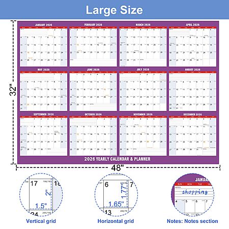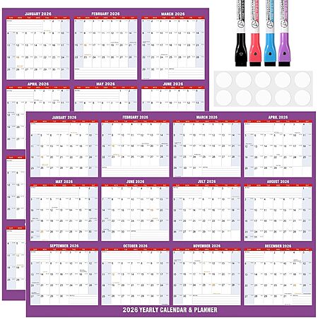 32" x 48" 2026 Dry Erase Wall Calendar w/ 4 Dry Erase Markers $6.99 + Free Shipping w/ Prime or on $35+
