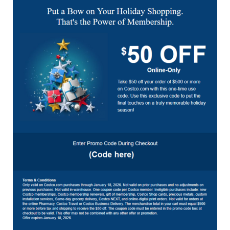 Only valid on Costco.com purchases through January 18, 2026. Not valid on prior purchases and no adjustments on previous purchases. Not valid in-warehouse. One coupon code per Costco member. Ineligible purchases include: new Costco memberships, Costco membership renewals, gift of membership, Costco Shop cards, precious metals, custom installation services, Same-day grocery delivery, Costco NEXT, and online-digital print orders. Not valid for orders at the online Pharmacy, Costco Travel or Costco Business Delivery. The merchandise total in your cart must equal $500 or more before tax and shipping to receive the $50 off. The coupon code must be entered in the promo code box at checkout to be valid. This offer may not be combined with any other offer or promotion.