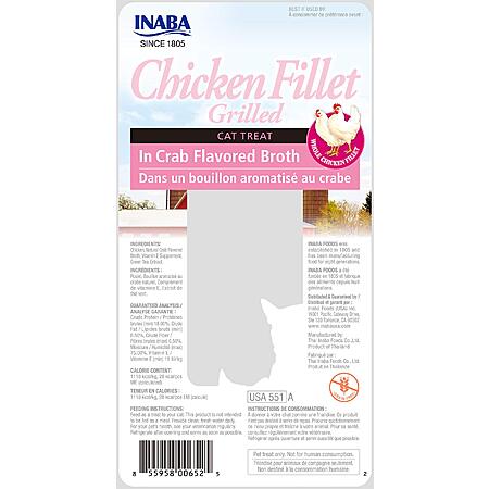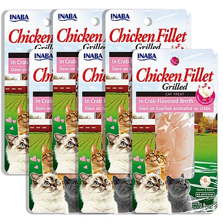 $7.03 INABA Premium Hand-Cut Grilled Chicken Fillet Cat Treats/Topper with Vitamin E and Green Tea Extract, 0.9 Ounces Each, Pack of 6, Crab Broth