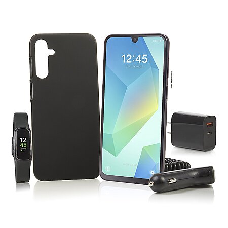 - Includes Galaxy A16 5G smartphone, case, car charger, wall charger, one year of service/1,500 minutes/1,500 texts/1.5GB data; Fitbit Inspire 3 Heart Rate Monitor and Fitness Tracker, USB cable, voucher