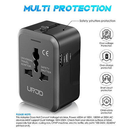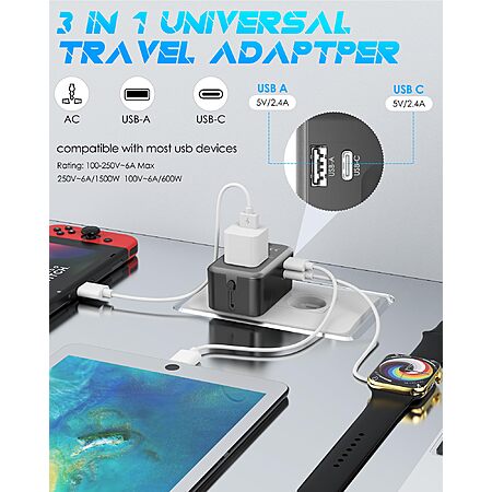 2500W AC Universal Travel Adapter Outlet w/ 2 USB-A & USB-C Port $5.64 + Free Shipping w/ Prime or on $35+