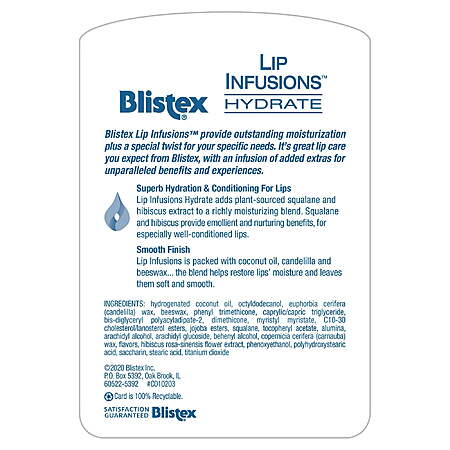 Blistex Lip Infusions provide outstanding moisturization plus a special twist for your specific needs. The formula is packed with coconut oil candelilla and beeswax providing a blend that restores lips' moisture and leaves them soft and smooth. Lip Infusions Hydrate adds plant-sourced squalane and hibiscus to provide emollient and nurturing benefits for especially well-conditioned lips. It's great lip care you expect from Blistex with an infusion of added extras for unparalleled benefits and experiences.