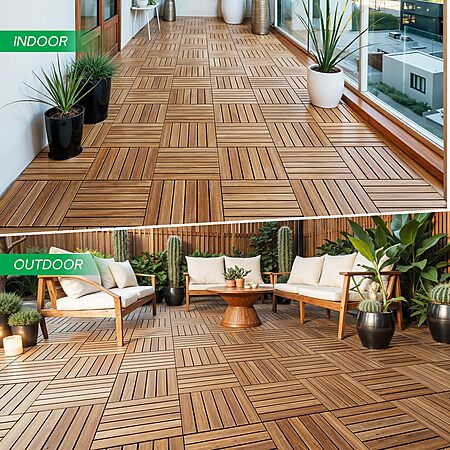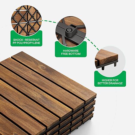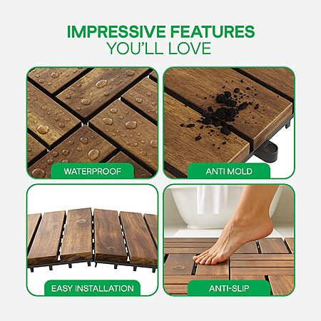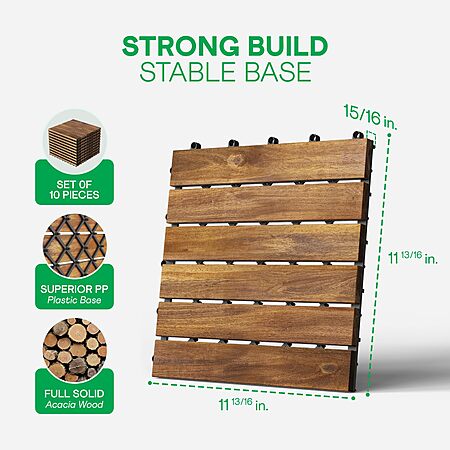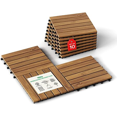 $30.43*:Idzo 9.6 SQFT Acacia Wood Deck Tiles (10PCS) - Waterproof Indoor/Outdoor Flooring, 11.81"x11.81", Golden