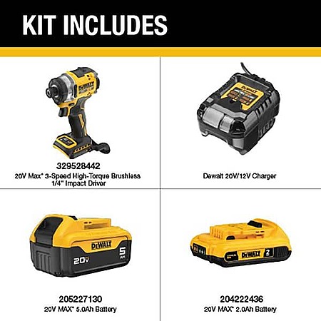 Model: 20-Volt MAX XR Lithium-Ion Cordless Impact Driver with 20-Volt MAX 5.0 Ah and 2.0 Ah Battery Packs and Charger