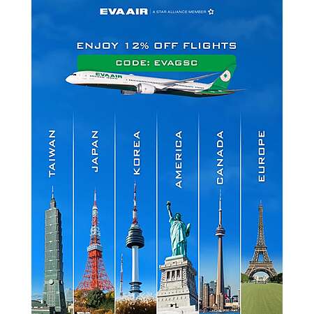 Book a new reservation using the promotional code below on EVA Air and enjoy 12% off your flights to Taiwan, Japan, Korea, America, Canada, and Europe. There is a current Chase Offer (ymmv) for